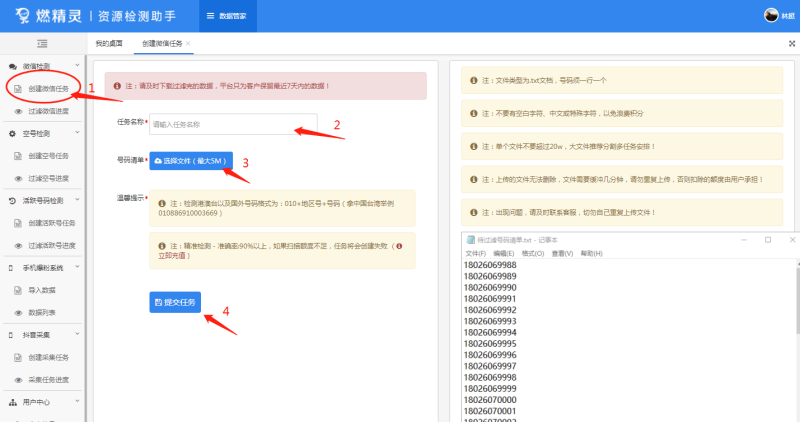 按图中的顺序,进行操作,将号码资源以TXT格式上传到网页后台,即可开始清洗数据,提交完任务耐心等待即可,本平台最多支持3个任务同时清洗。